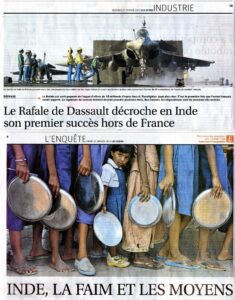 Ci-contre, en-têtes de 2 articles du journal économique Les Échos. Celui d’en bas date du 31 janvier 2012, celui du dessus date du lendemain. Autres titres du journal concernant la potentielle vente du Rafale : « New Delhi, un acheteur insatiable de matériel militaire », « Le succès qui tombe à pic pour les finances publiques françaises ». Quelques extraits des articles : « l’Inde achète actuellement pour 12 à 15 milliards de dollars par an de matériel militaire »; « la Chine en dépense de 30 à 50 »; « l’environnement géostratégique explique cette soif d’équipement »; « 230 millions d’Indiens ont faim chaque jour »; « 21 % de la population indienne est sous-alimentée, 43,5 % des enfants de moins de cinq ans ont un poids inférieur à la normale, le taux de mortalité dans la même tranche d’âge est de 6,6 % »; « la facture annuelle des achats de nourriture par le gouvernement Indien pourrait passer de 10 à 15 milliards d’euros » …