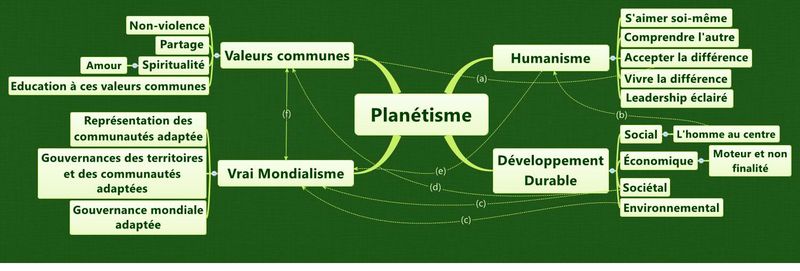 Cette carte reprend les quatre axes initiaux du Planétisme de 2008 : Humanisme, Développement Durable, Vrai Mondialisme et Valeurs communes, enrichis depuis par des lectures, formations, expériences et réflexions.