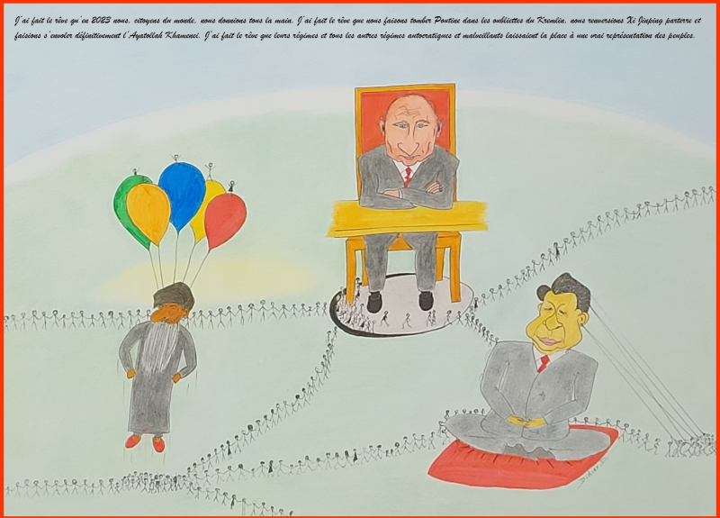J’ai fait le rêve qu’en 2023 nous, citoyens du monde, nous donnions tous la main. J’ai fait le rêve que nous faisons tomber Poutine dans les oubliettes du Kremlin, nous renversions Xi Jinping parterre et faisions s’envoler définitivement l’Ayatollah Khamenei. J’ai fait le rêve que leurs régimes et tous les autres régimes autocratiques et malveillants laissaient la place à une vrai représentation des peuples.